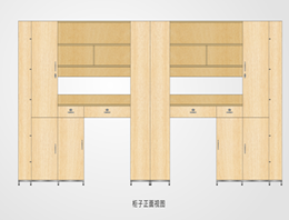 4-2、柜子总长:3898mm,柜子总高1450 mm,单个柜总长1949 mm。衣柜宽600mm,深600mm,高1450 mm,衣柜柜门为半开式柜门,采用个暗式蝴蝶铰链,内置不锈钢挂衣杆;书桌长1049 mm,深600 mm,高760 mm,书桌里口上岩加100mm档条,书桌下设两抽屉一带门柜,抽屉分别长398mm、645mm、深400mm;书桌上设三层小书架,小书架共三层,第一层书架高300mm;第二小书架高252mm,中间用一块站板隔开,二层板底部外口加80mm层托;第三层小书架高252mm,此层小书架无顶板。侧边大书架,总高1450mm,深290mm,,长800mm上下共五层,上三层下两层,上三层高度同小书架,下两层,层高分别为, 340mm、209mm。